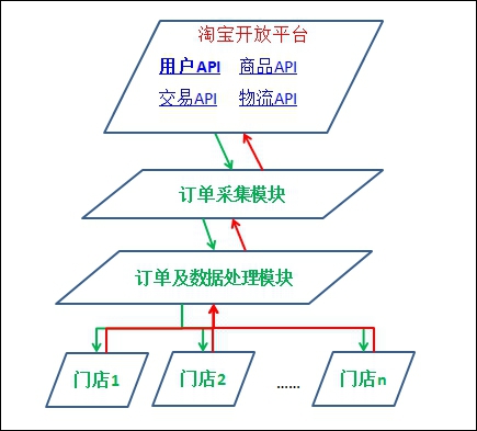 在产品的构架方面,我们任务主要分成3大部分,分别是“淘宝卖家应用界面模块”;“订单采集模块”;“订单及数据处理模块”,主要构架图如下: