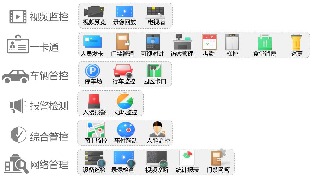 利用卡片、人脸、指纹等媒介,实现身份识别、出入管控、巡更、考勤、食堂消费等智能应用。