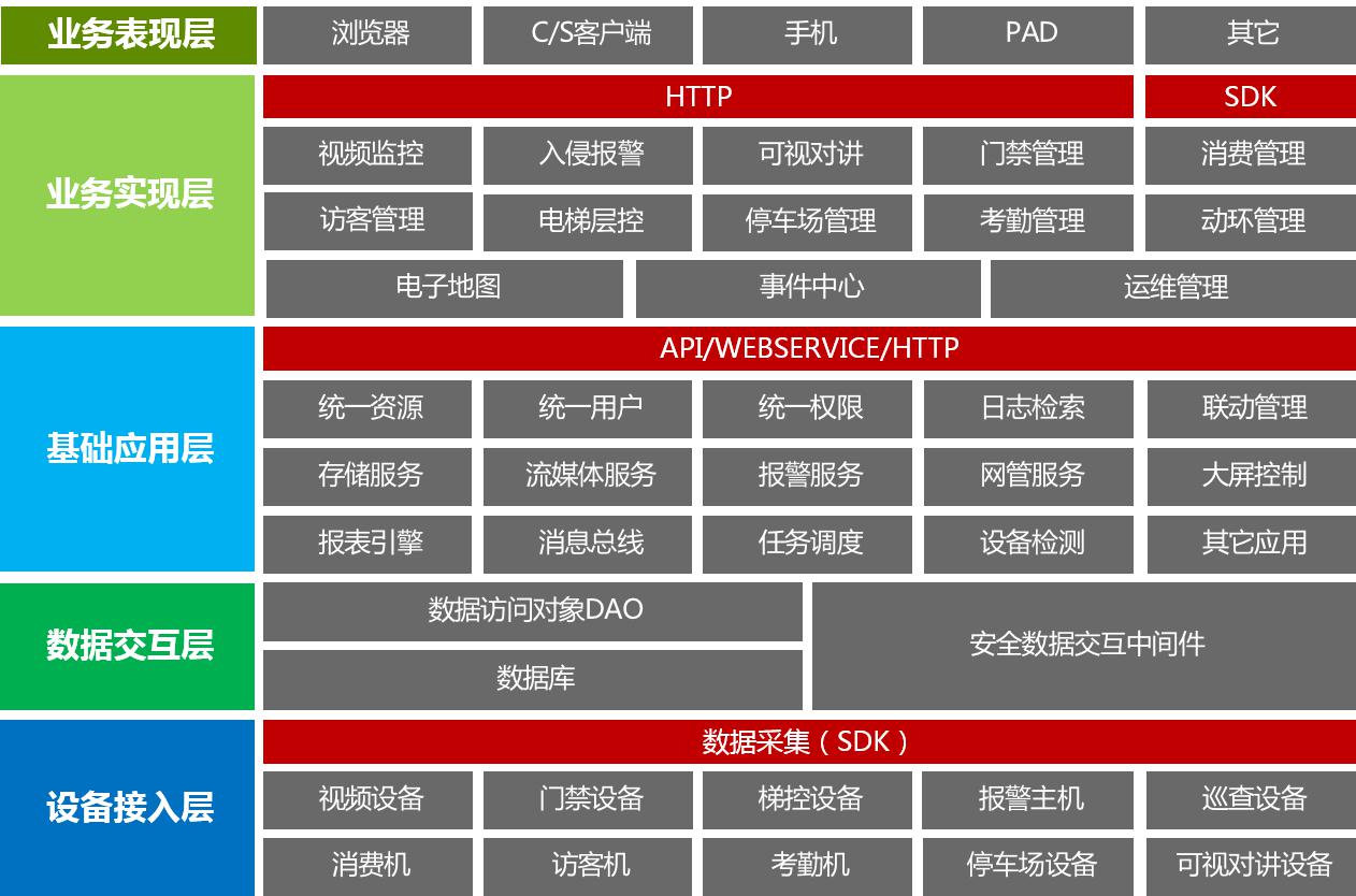 提供一套综合智慧园区管理平台软件,实现软件功能扩展,把各功能模块进行整合,实现各应用子系统间的资源共享与信息互通。从系统架构上分为设备接入层、数据交互层、基础应用层、业务实现层、业务表现层。
